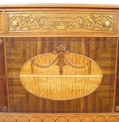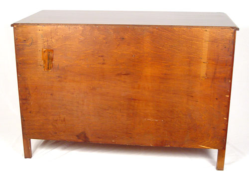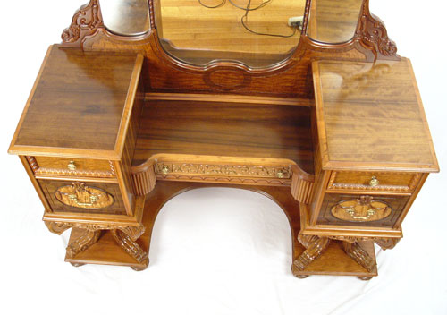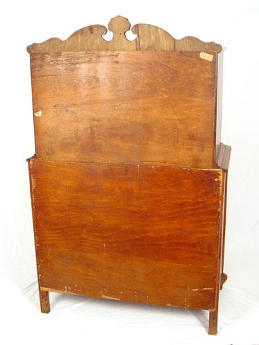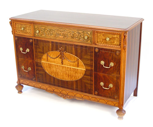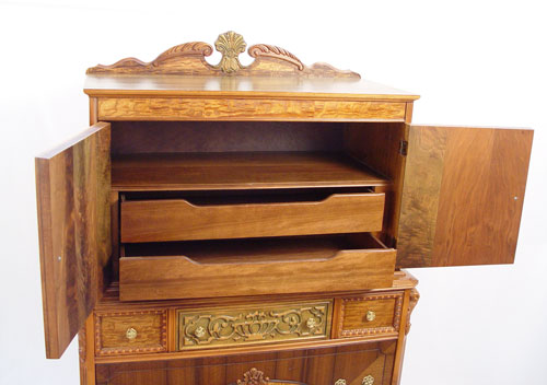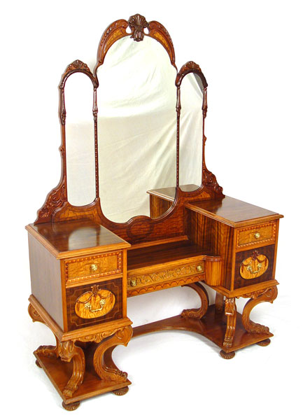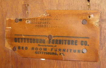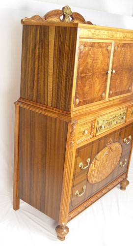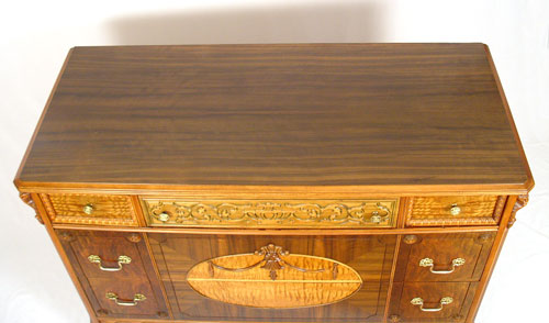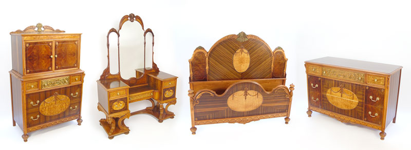 EARLY 20TH C DECO 4 PC BEDROOM SET BY GETTYSBURG FURNITURE CO : Burl and mixed wood veneers. The set includes A FULL SIZE BED, triple mirror VANITY, 3 over 2 drawer CHEST and a tall BACHELORS CHEST. Measurements for shipping are full size bed headboard is 52 1/2''h. x 57 1/2'' w, footboard 28 1/2'' h. with side boards. The mirror can be separated from the vanity. If not separated, the mirror is 68 1/2'' high, vanity is 30'' h. x 18 3/4'' d x 48 1/2'' w. Mirror by itself overall width 45'' x 47'' tall. The 3 over 2 drawer dresser is 50'' w x 34 1/2''h. x 22'' d. Tall bachelors chest is 60 1/2'' h, 37 3/4'' wide x 20'' deep.