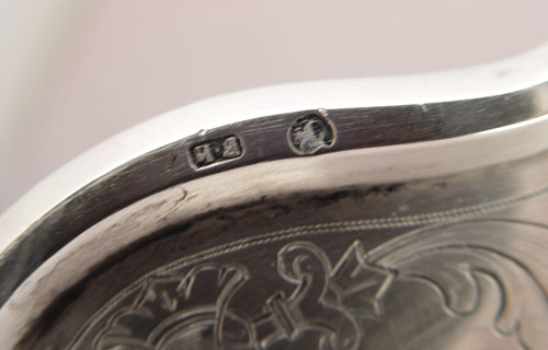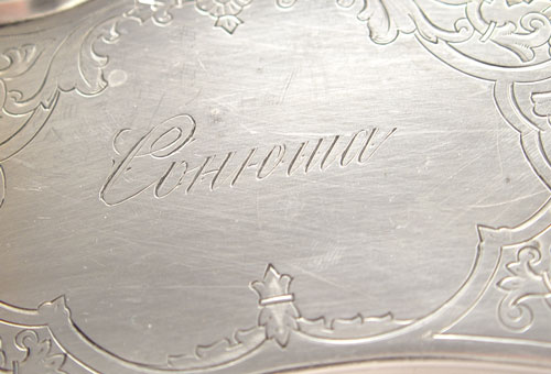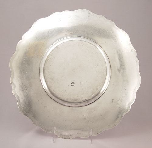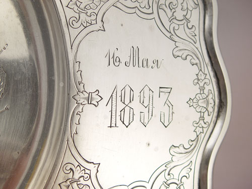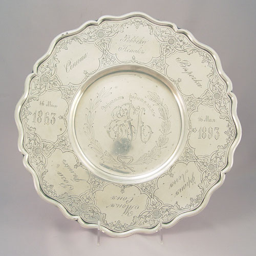 LATE 19TH CENTURY RUSSIAN SILVER TRAY: Hallmarked 84 Moscow 1890 with unknown makers stamp. Ornately inscribed with Russian writing, patterns and dates 1863, 1893. Measures 14'' in diameter. Approx 25.2 troy oz.
