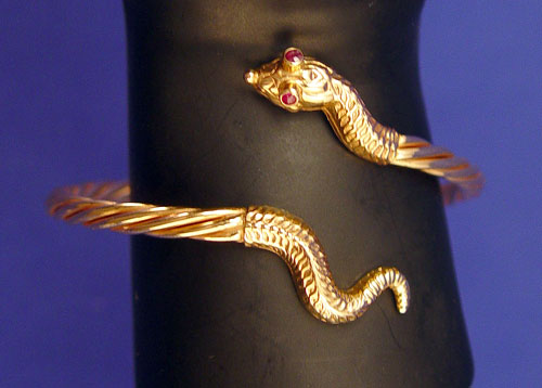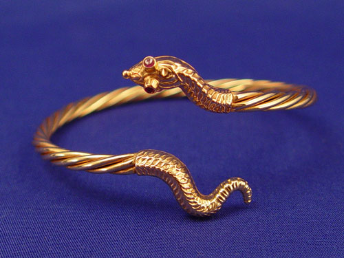 14K SNAKE BANGLE BRACELET WITH RUBY EYES: 14K yellow gold by-pass design snake motif bangle bracelet. Twisted cable bangle with head and tail on ends of by-pass. Two round 1.00 mm rubies are set in the eyes of the snake. Approx. 2.50'' in diameter. Weight: 15.1 grams.