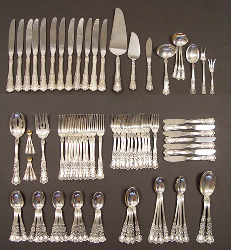 WALLACE GRAND BAROQUE STERLING FLATWARE SERVICE for 12: 82 pieces in the Grand Baroque pattern by Wallace Silver to include 12 dinner forks 7 1/4'', 12 salad forks 6 5/8'', 12 teaspoons 6 1/4'', 12 iced teaspoons 7 5/8'', 12 dinner knifes 9'', 12 butter knifes 6 3/8'', flat handle master butter knife 7 1/2'', gravy ladle 6 3/8'', cream ladle 6 1/4'', 2 serving spoons 8 3/4'', lemon fork 5 1/2'', jelly server 6 7/8'', meat fork 6 1/4'', 2 piece carving set, knife 11'', fork 9 3/4''. No monograms. Sold with silver chest by Nakens. Engraved plaque on chest. Chest measures 15 1/4'' x 11 1/4'' x 5 3/4''. Approx. 107.1 troy oz.
