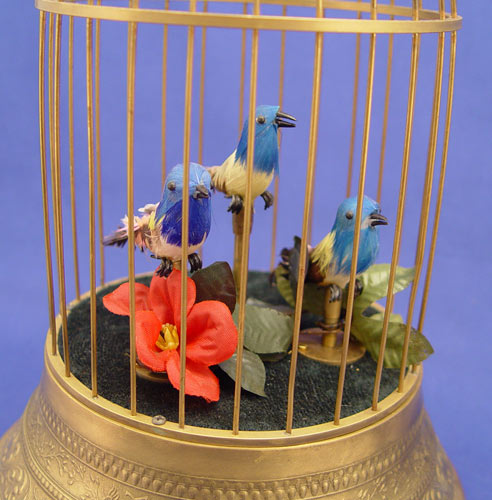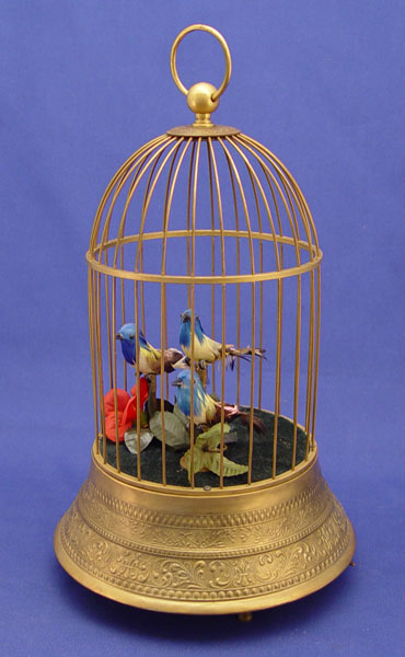3 BIRD SINGING AUTOMATON: 3 birds in brass cage. Tails and beaks move and chirp on 2 birds, 3rd bird head swivels back and forth as well. Chirping is very faint. Measures 11'' high x 7'' dia.