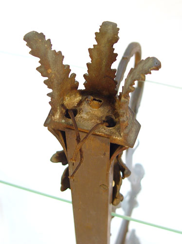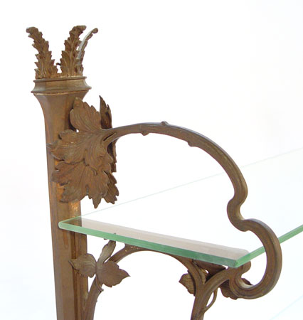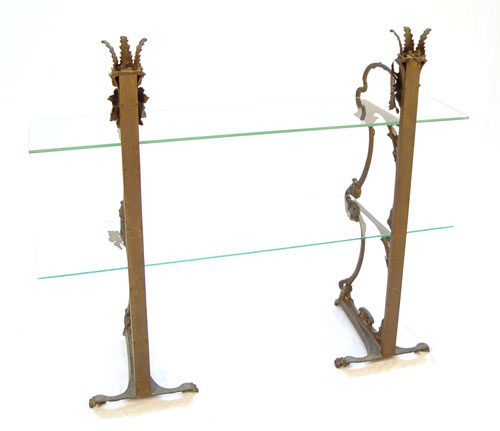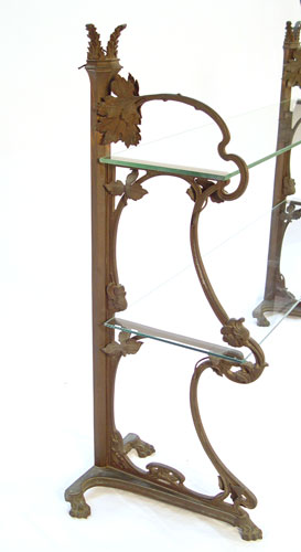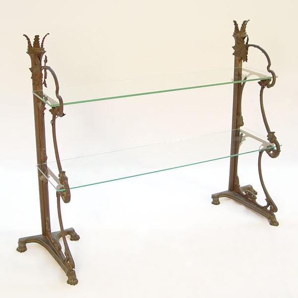 AESTHETIC MOVEMENT BRONZE SHELF STAND: Two bronze end supports, glass shelves. 3 claw feet base with leaf designs on side. Loss of electric torchiere components. Measures approx. 35'' high x 14 1/2'' deep. Larger bottom shelf measures 40 1/2'' x 10 1/2''. Top shelf measures 40'' x 9''.