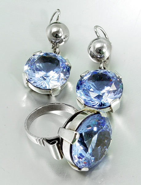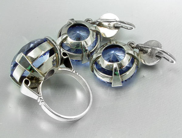EYE POPPING 14K SPINEL RING AND EARRINGS: 14K white gold ring and earrings with two 18 mm and one 19.5 mm round mixed cut synthetic spinel. The spinel are prong set. Weight: 38.4 grams.