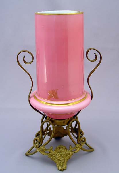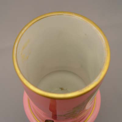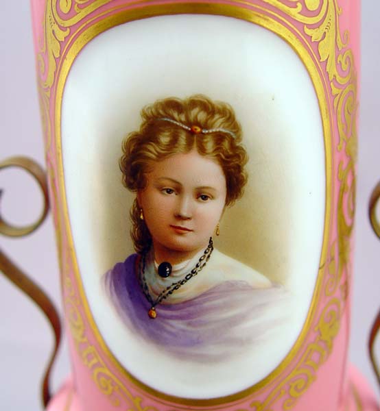 19th C BRONZE MOUNTED PORTRAIT VASE: Cased pink glass centering hand painted portrait. 11 3/8'' high overall.