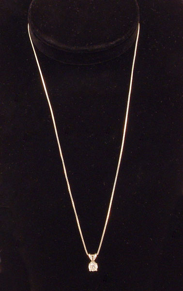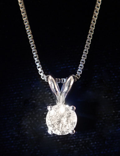 .72 CT. SOLITAIRE DIAMOND PENDANT: 18K white gold pendant set with a round brilliant cut diamond approx. .72 Ct. The diamond is rated I1 in clarity and I in color. The diamond is prong set. Sterling silver 18'' box chain. Weight: 3.2 grams.