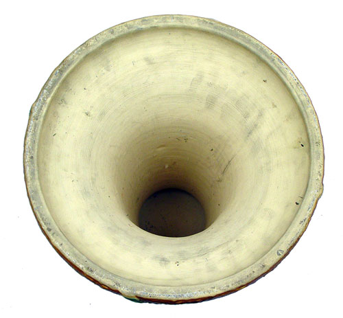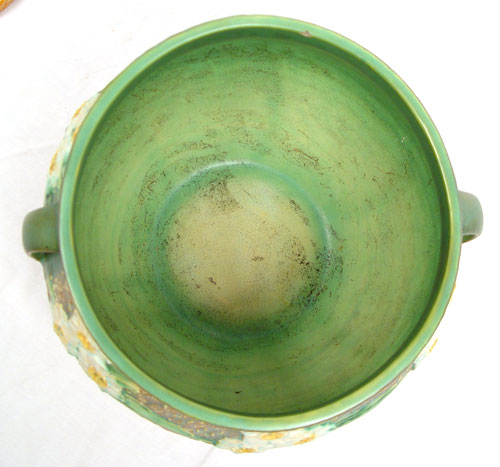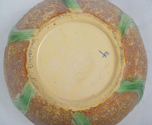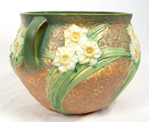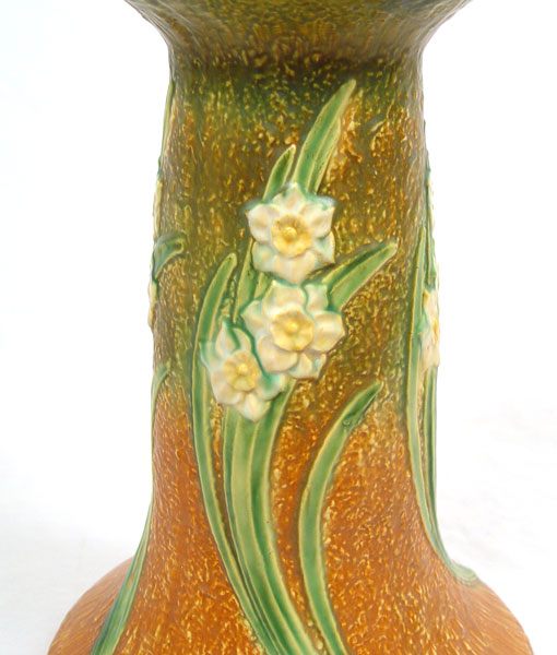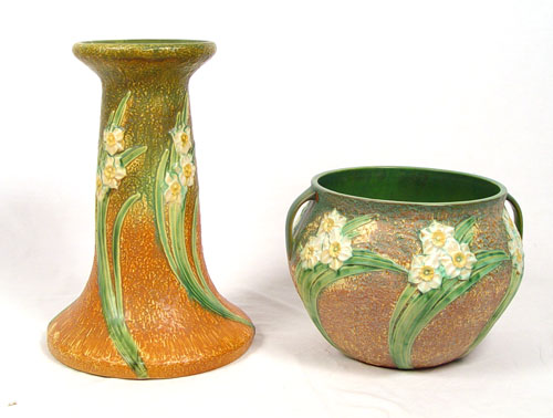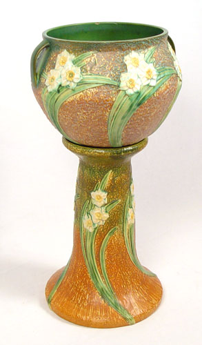 ROSEVILLE ''JONQUIL'' POTTERY JARDINIERE AND PEDESTAL: The jardiniere has blue ink mark, measures 10'' high x 11 1/2'' rim dia., 14 1/2'' overall dia. The pedestal is 18 1/2'' high x 13'' dia. at the base. Please note small chip on rim of jar.