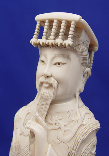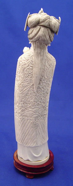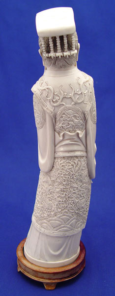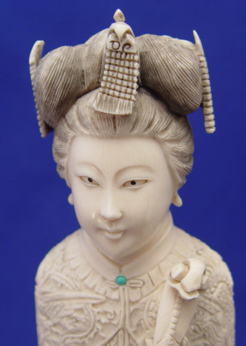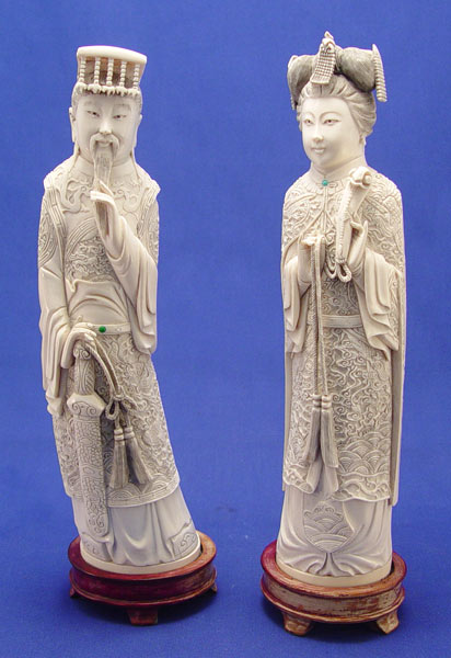 PAIR IVORY CARVED FIGURES, MALE & FEMALE: Highly detailed carvings from tusks, impressed carved marks under base. Ivory is 12 1/2'' high and 12'' high.