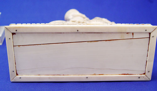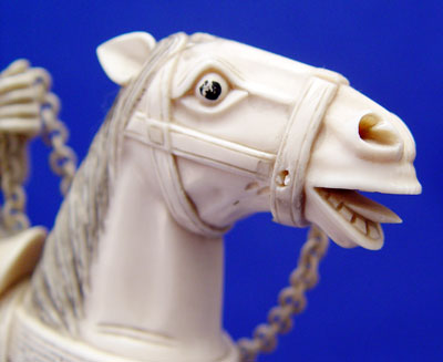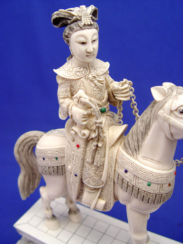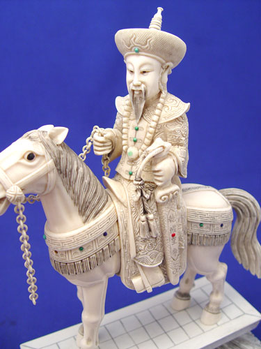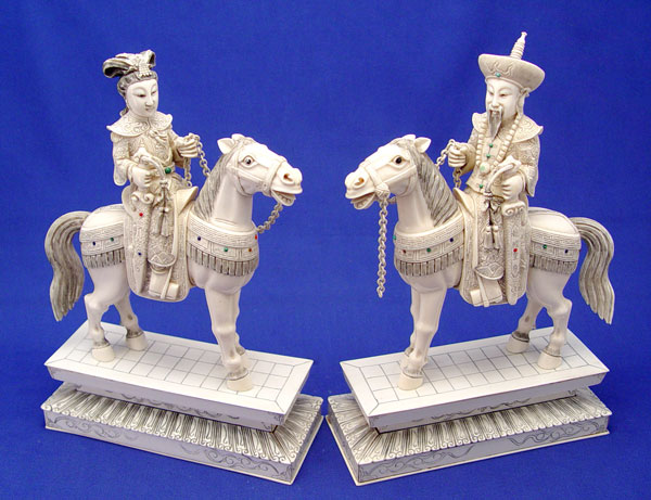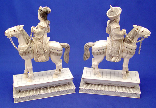 CHINESE CARVED IVORY FIGURES ON HORSEBACK: Emperor and Empress affixed to iron clad base. 10 1/2''h. x 7 1/2'' x 3'' overall. Incised character under base.