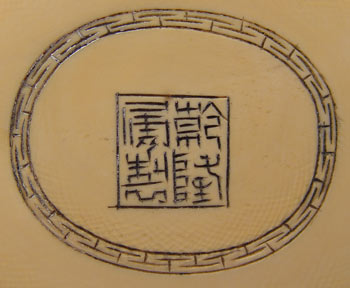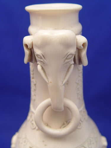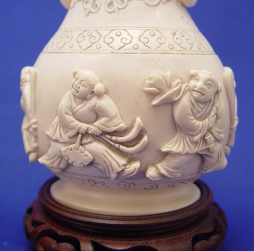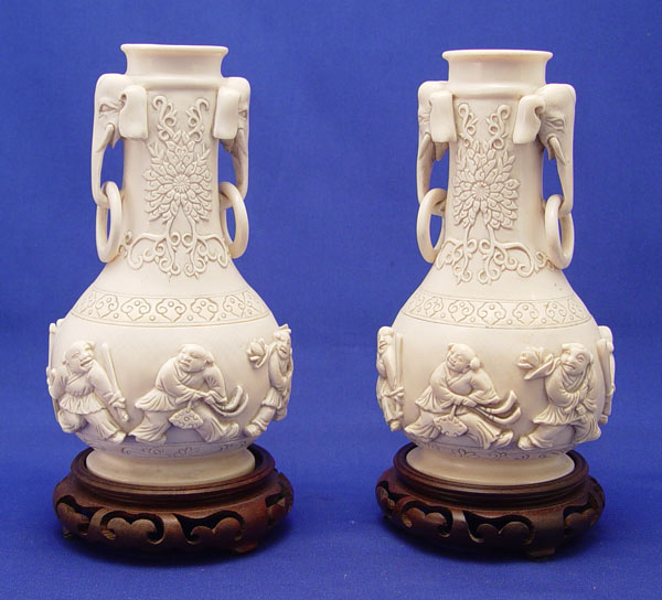 PAIR ASIAN CARVED IVORY VASES: Relief carved figural decoration with ringed elephant head handles. Signed, ivory alone is 7 3/4''h. Sold with the wood stands.