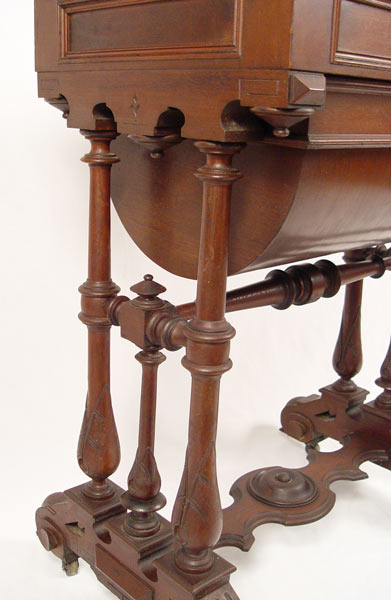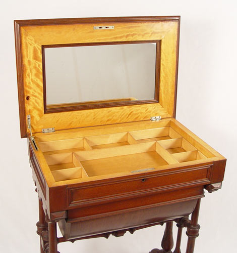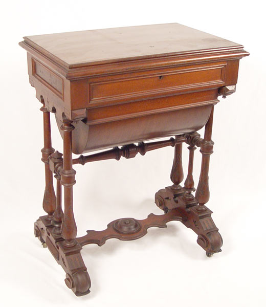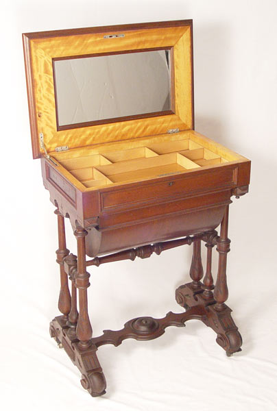 VICTORIAN WALNUT WORK STAND: Sewing table with hinged lift top. Compartmented interior with mirror lid. Lower deep dome drawer stores the work in progress. fine turned and carved legs and stretcher. 31.5''h. x 26'' x16''.