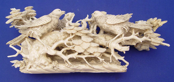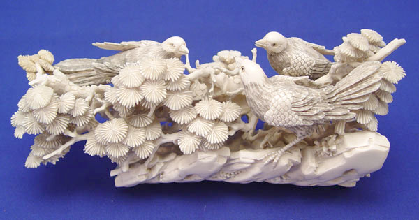 INTRICATELY CARVED IVORY 3 BIRDS IN A BUSH: Open work foliate carving from a single tusk, carved characters on bottom. Approx. 3 1/2''h. x 9''