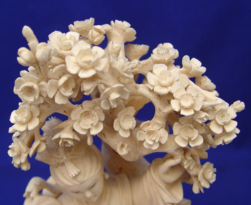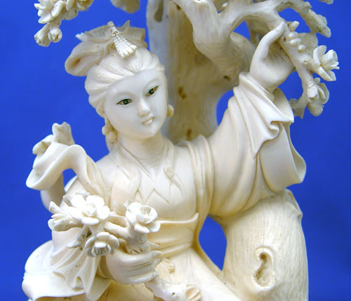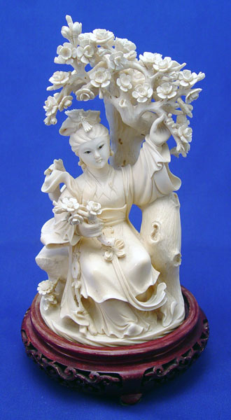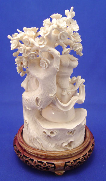 CHINESE CARVED IVORY LADY UNDER TREE: Lady under plum tree in blossom. Ivory is 9 1/2'' high x 4 1/2'' dia. at the base. Sold with wood stand.