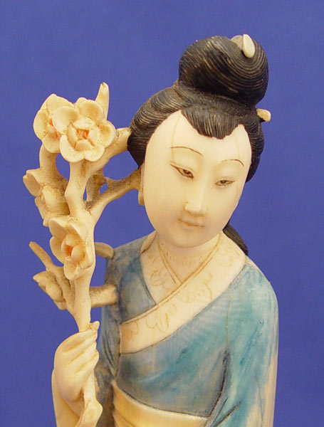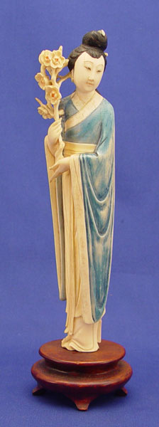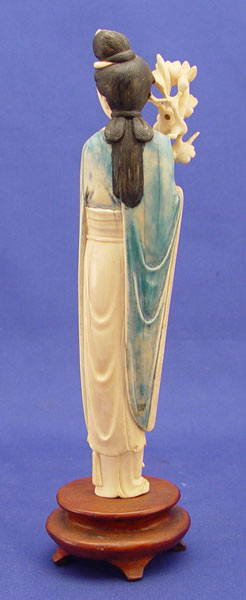 HAND TINTED IVORY GEISHA ON STAND: Standing geisha holding branch with flowers. Hand tinted or painted robe and hair, on wood stand. No visible signature. Geisha measures 9 1/4'' high. Stand measures 1 1/2'' high.