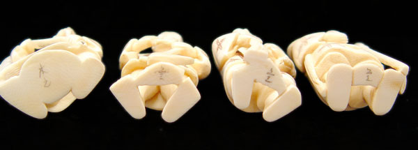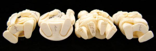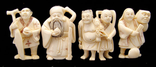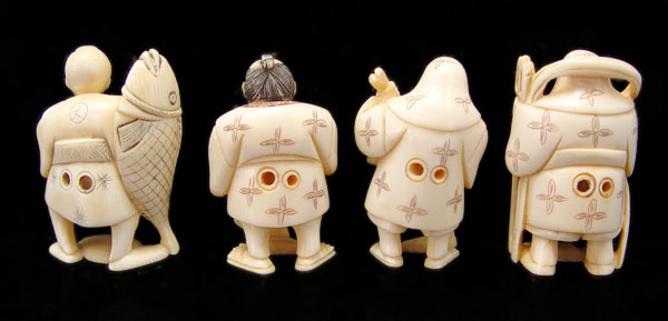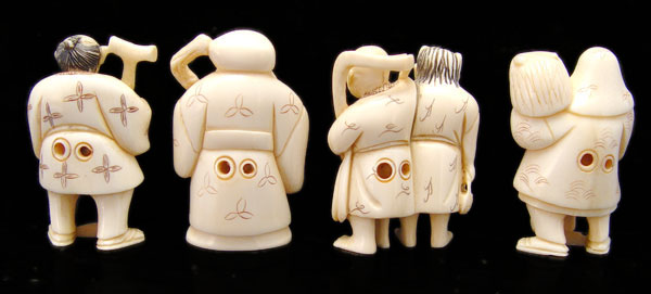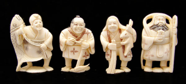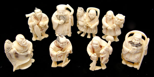 LOT OF 8 NETSUKES IVORY: To include 1) 2 figures with flowers 2'' high. 2) Man with large fish 2'' high. 3) Short man with hoe 2'' high. 4) Man with trident 2'' high. 5) Man with rabbit by the ears 2'' high. 6) Man holding mask 2'' high. 7) Elderly man with staff 2'' high. 8) Man with oar 2'' high. All signed in characters on base.