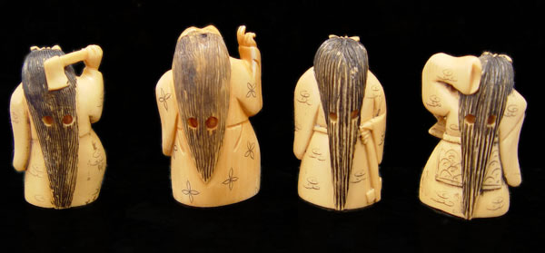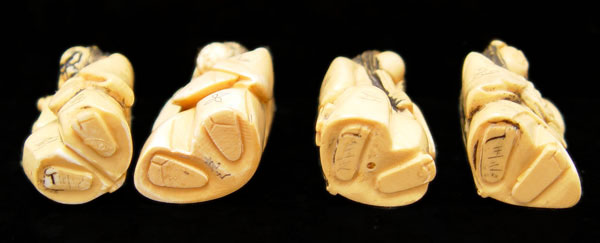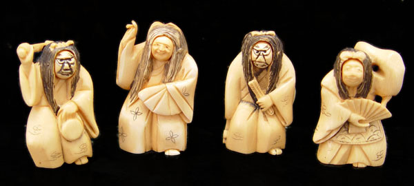LOT OF 4 IVORY TWO FACED NETSUKES: Rotating 2 face to include 1) Woman holding fan upright 2'' high. 2) Woman holding fan down 2'' high. 3) Woman holding drum 2'' high. 4) Woman holding closed fan 2''. All signed in characters on base.