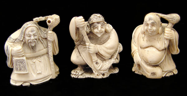 LOT OF 3 IVORY NETSUKES: To include 1) Man with staff 2'' high. 2) Man catching fish 2 1/8''. 3) Man brushing hair 2 1/8'' high. All signed in characters on base.