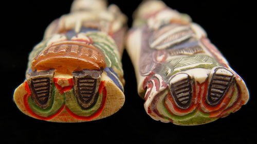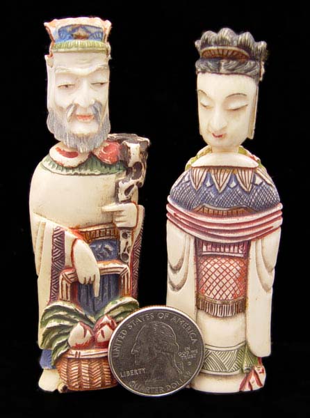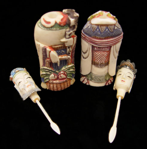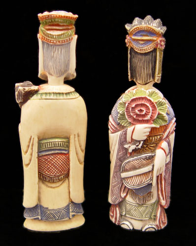 PAIR OF IVORY FIGURAL SNUFF BOTTLES: To include man holding staff with basket of vegetables at feet. Hand tinted. Measures 3 1/8'' high. Woman holding flower and fan. Hand tinted. Measures 3 1/8'' high. Both heads remove with snuff spoon at base of neck. No visible signature.