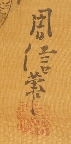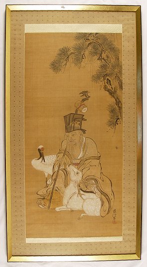 EARLY JAPANESE SCROLL: Japanese scroll with God of Longevity and pine, crane, deer of immortality, W/C, 34'' x 16'' sight size, signed, framed, 43'' x 22'', age unknown.
