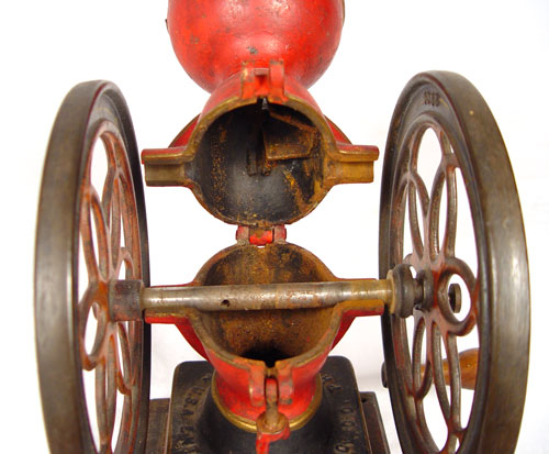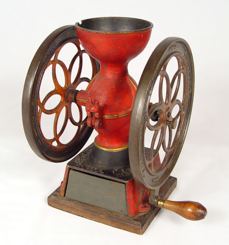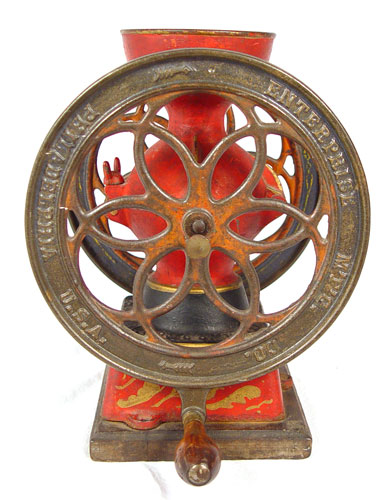 ENTERPRISE #2 COFFEE MILL: Some original paint and decoration remains. 8 3/4'' wheels, 11 1/2'' tall with wood base. Missing lid, chip in top where lid connected, Wheels spin, missing internal works. Replacement drawer. In need of restoration. Marked Enterprise Mfg. Co. Philadelphia USA Pat Oct. 21 '73. Wgt.13 lbs.