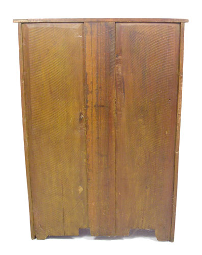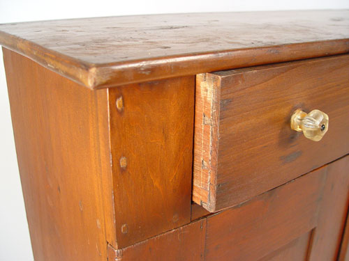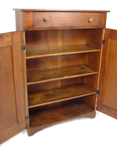 AMERICAN COUNTRY PRIMITIVE JELLY CUPBOARD: Dovetail and peg construction, pine wood. Single drawer over paneled doors. Shelved interior. 56 1/2'' high x 40'' wide x 15'' deep.