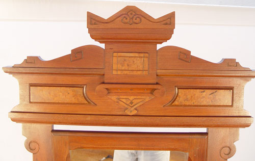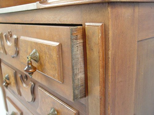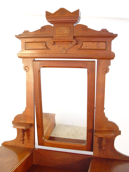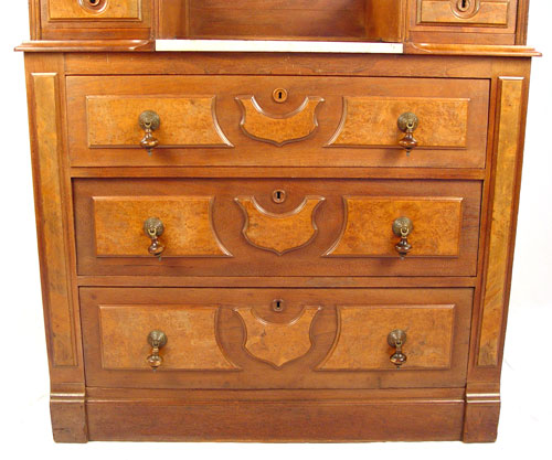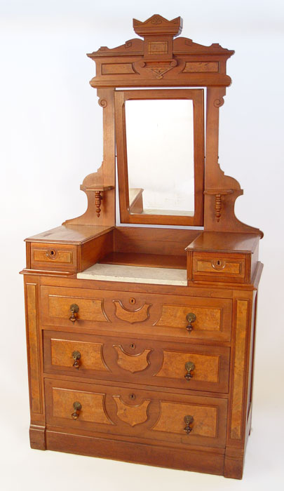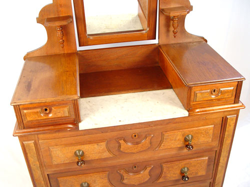 VICTORIAN MARBLE TOP DRESSER WITH MIRROR: Shaped and panel crest over swing mirror. Glove boxes center marble. 3 full length drawers with drop ebony pulls. Burled panels throughout. Approx. 76 1/2'' high x 39 1/2'' wide x 19'' deep