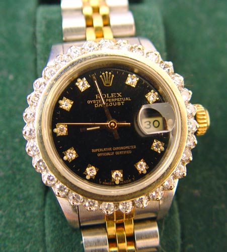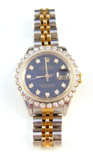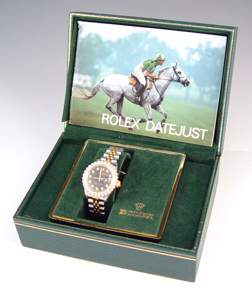 ROLEX LADIES DIAMOND OYSTER PERPETUAL DATEJUST WATCH: Movement model 2135, case R203321, movement 069256x, stainless and 18k Jubilee bracelet clasp marked #62523D-18, approx. 6.75''. Diamond bezel set with 31 round single cut stones, black dial with diamond markers at all but 12 and 3. Sold with the original box and booklet.