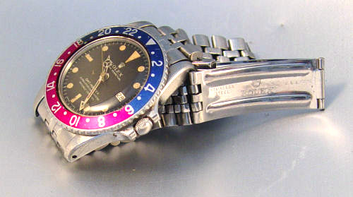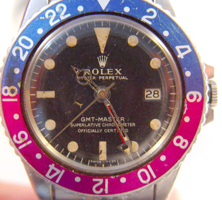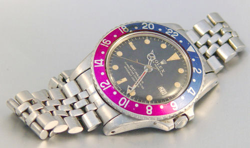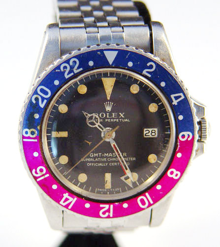 ROLEX GMT MASTER OYSTER PERPETUAL MAN'S WRISTWATCH: CASE #1843832 MODEL #D137144 Rolex Oyster Perpetual, ''GMT Master'', Superlative Chronometer, 26 jewel movement model 1570 dated to 1966, two-time zone, center-seconds, self-winding, Water-resistant, stainless steel gentleman's wristwatch with date, special 24 hour bezel and hand. Black dial is featuring tritium-coated round indexes with foxing. Original tritium-coated steel hands. Movement Cal. 1570 .Diam. 40 mm. Replacement stem that will not screw down, running but needs service according to our retired horologist.