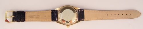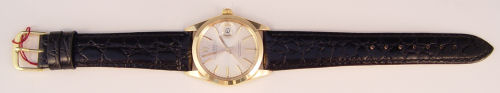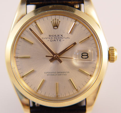 ROLEX MAN'S 14k OYSTER PERPETUAL DATE WATCH: 14k yellow gold case, Movement 1570, case #14xxx39, movement #45965?, new crystal and leather band.