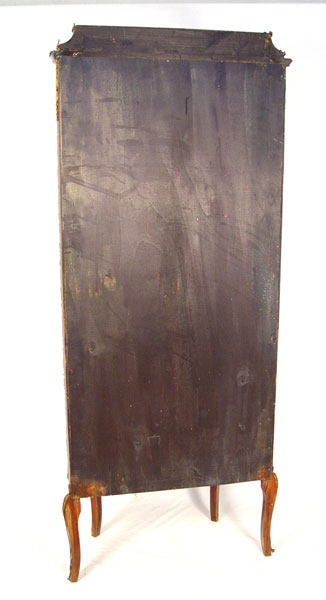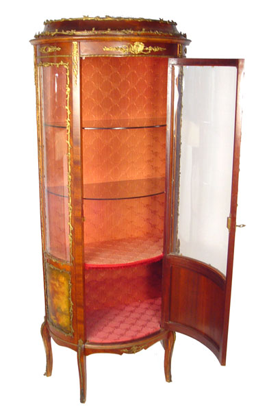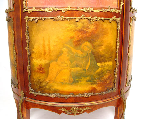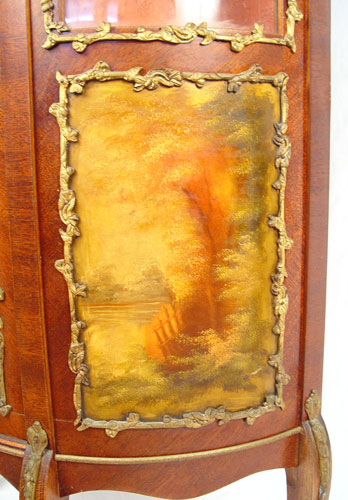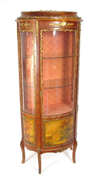 FRENCH CURIO CABINET: Rich with ormolu and hand painted panels to bowed front and sides. Fabric back interior, glass shelves. Bowed Plexiglas front and sides. 64 1/2'' high x 26 3/4'' wide x 15'' deep.