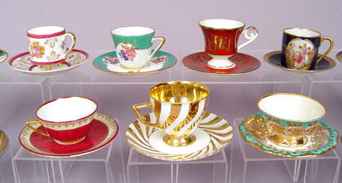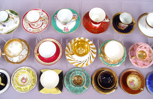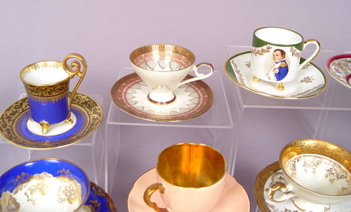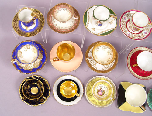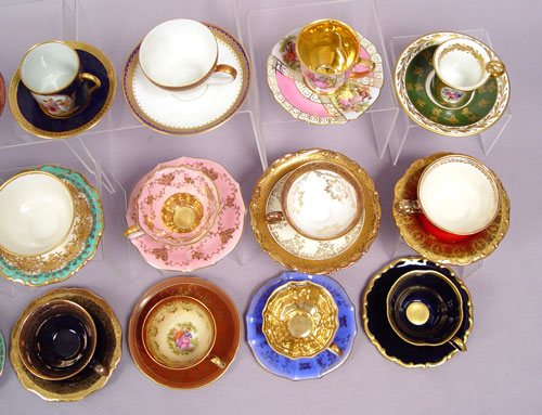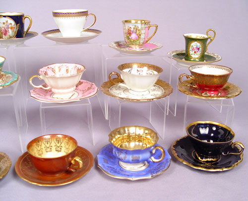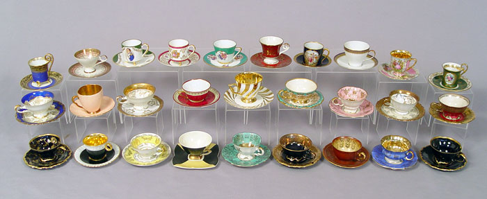 LIFELONG COLLECTION OF 28 BAVARIAN FINE CHINA DEMITASSE CUPS & SAUCERS: Courting scenes, cobalt, footed, gilt. Sold with approx. 24 display stands.