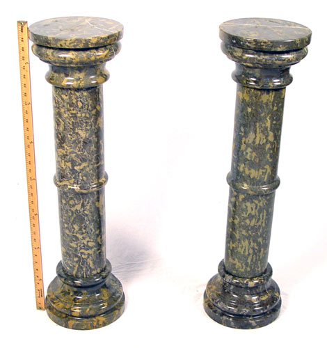 PAIR POLISHED VARIEGATED MARBLE PEDESTALS: 3 part construction, approx. 2' 11'' high x 10'' dia. Please note repair to base of 1.