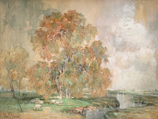 BRANNAN, Sophia Marston (American 1877-1960): Grazing Sheep in Landscape, Gouache, 18 1/2'' x 24 3/4'', signed, framed, 20'' x 27''.