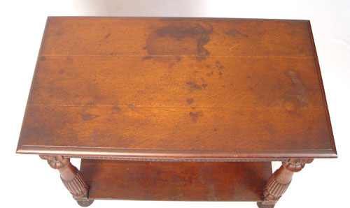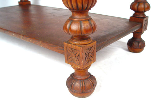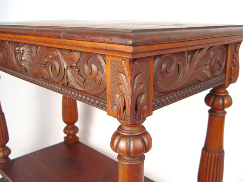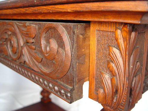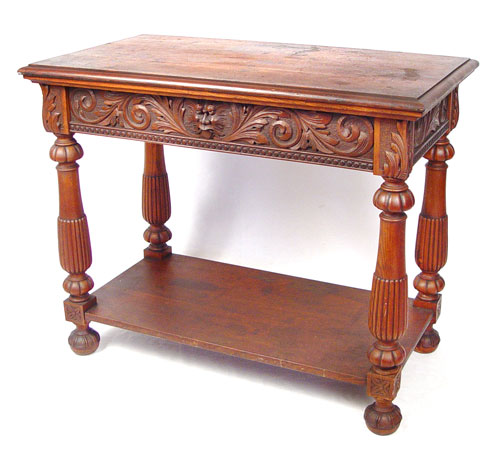 HORNER QUALITY CARVED OAK HALL TABLE: Northwind carved full length drawer, stretcher base. Measures 29 1/2'' high x 36'' wide x 20'' deep. Please note marred surface.