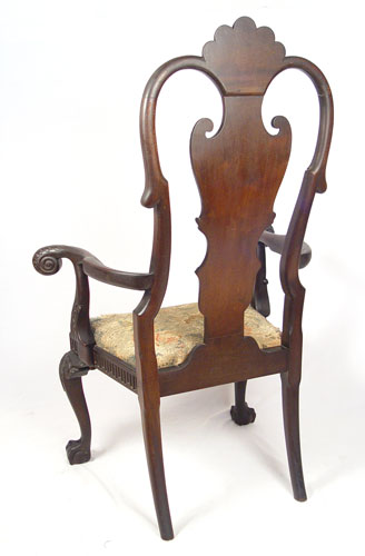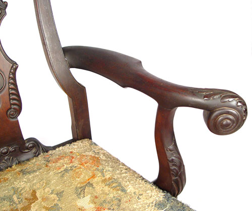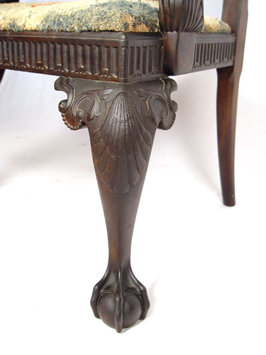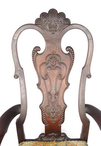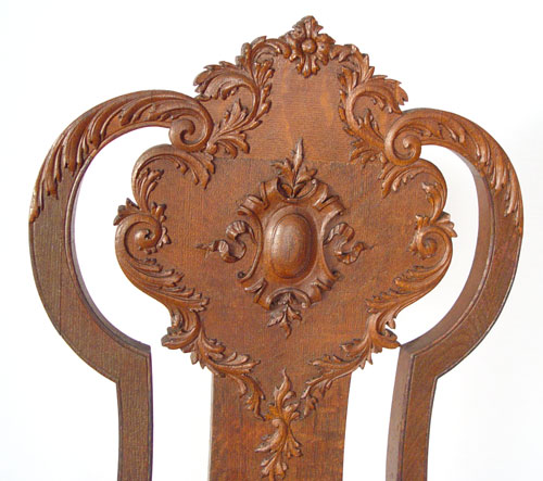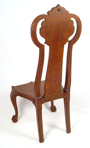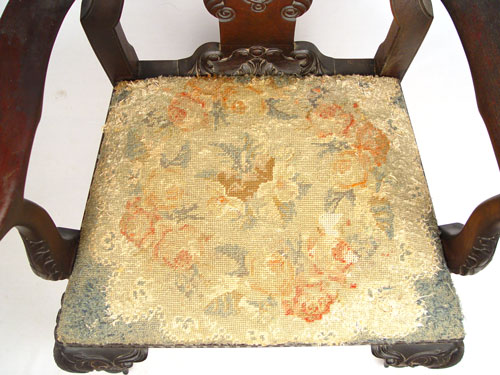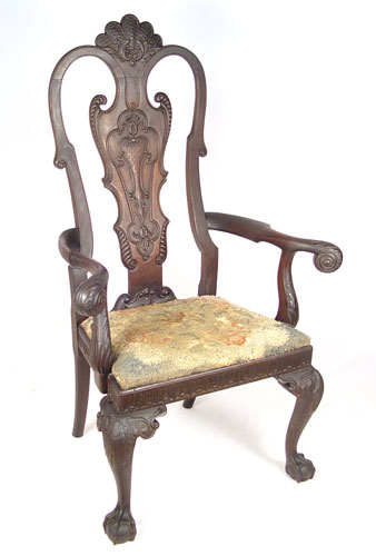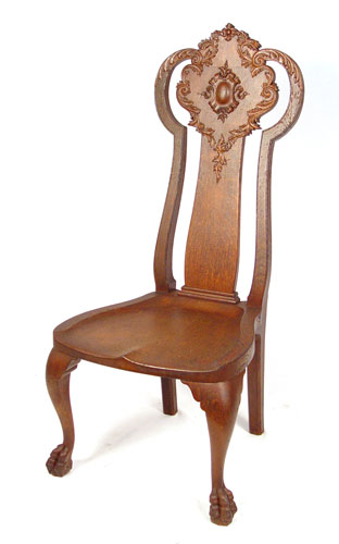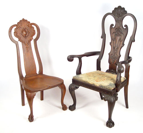2 LATE 19TH CENTURY CARVED CHAIRS: 1) Mahogany throne chair with carved splat under fan carved crest. Scallop shell carved cabriole legs ending in detailed ball and claw feet. Arms end in acanthus leaf and scrolled hand holds. Measures 54'' high x 32'' x 21''. Very worn needlepoint seat. 2) High back carved oak side chair. Floral and acanthus leaf crest. Cabriole legs ending in claw feet. Measures 48'' high x 20 1/2'' x 20''. Alligatored finish is flaking.
