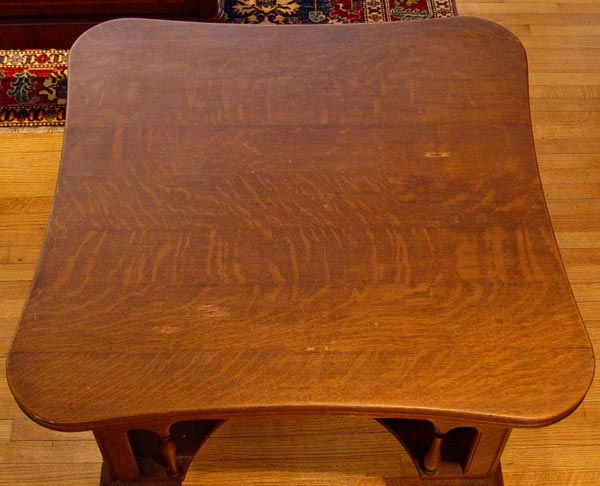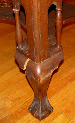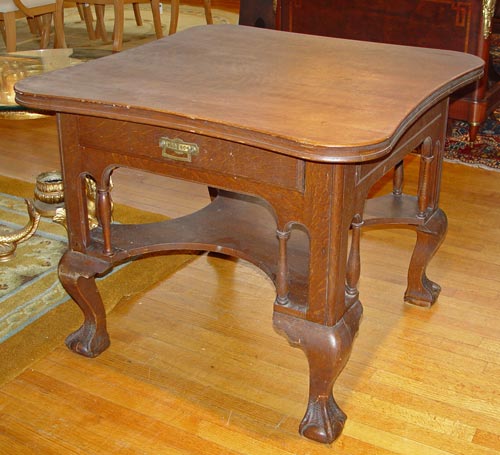 TURN OF THE CENTURY GOLDEN OAK PARLOR TABLE: Shaped top over the lower tier, ball and claw feet. Single drawer. Measures 29'' high x 36'' square. Note missing piece on one leg.