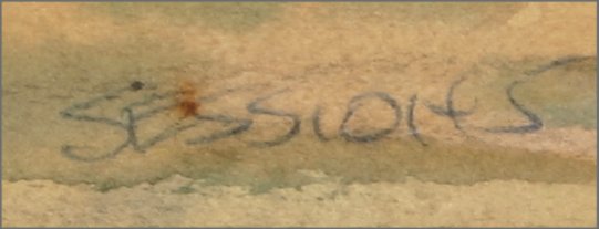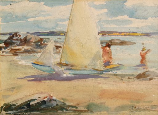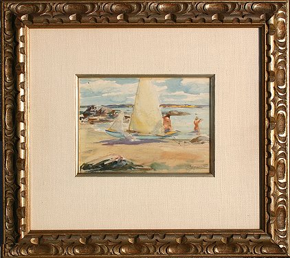 SESSIONS, James (American, 1882-1962): ''Annisquam Beach, Cape Cod'', depicts 2 nude bathers with beached sailboat, Watercolor, 6 1/4'' x 9'' sight size, signed, titled verso, carved and gilded frame, 17 1/2'' x 20''.