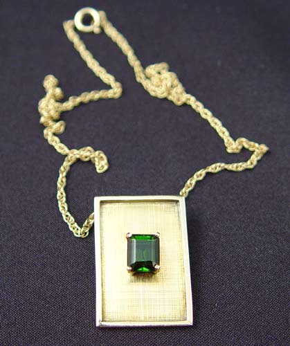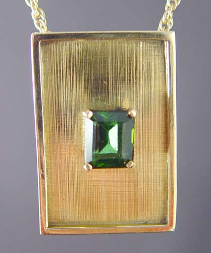 2 CT GREEN TOURMALINE PENDANT & CHAIN: 14K yellow gold pendant with one emerald cut 2.00 Ct. green tourmaline. Rated VS in clarity, slyG in Hue, 7 in Tone and 2-3 in Saturation. The tourmaline is prong set. Pendant measures approx. 1 1/8'' x 1''. 14K 16'' yellow gold fine rope chain. Weight: 9.4 grams.