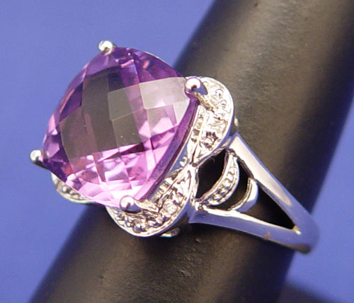 5 CT CHECKER BOARD CUSHION AMETHYST RING: 14K white gold ring with 5.00 Ct. cushion checker-board cut amethyst. Rated VVS in clarity, slpR in Hue, 2 in Tone and 2 in Saturation. Set with four round full cut diamonds, approx. .05 CTW. Rated I1 in clarity and H-I in color. Size 7. Weight: 5.6 grams.