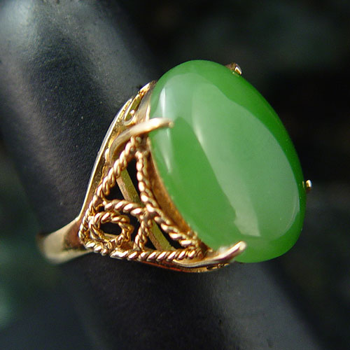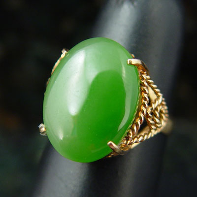14K GREEN CABOCHON RING: Green cabochon, possibly jade, set in 14K yellow gold. The stone is approx. 16.5 mm oval, 4.mm deep. Size 6.75.