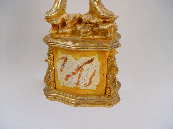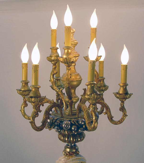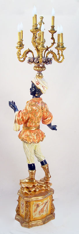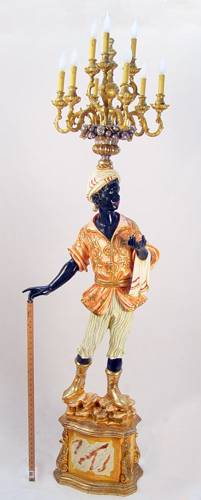 BLACK A MOOR FIGURAL FLOOR LAMP: Painted and gilt wood figural floor chandelier. Contemporary European purchase by consignor. Approx. 82 1/2'' high x 26'' wide at widest point.