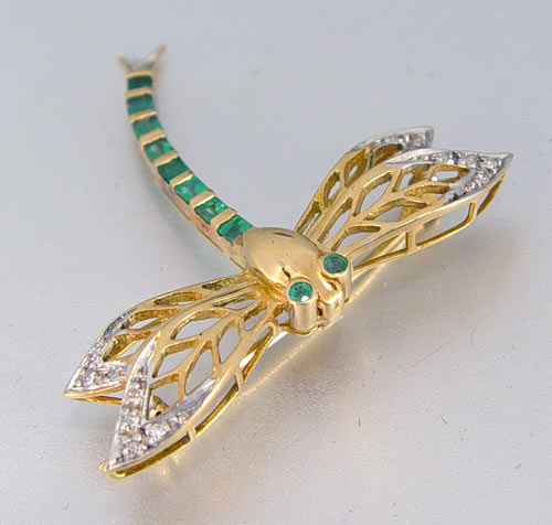 18K GOLD, EMERALD AND DIAMOND DRAGONFLY BROOCH: 18K yellow gold dragonfly brooch with ten round and square cut emeralds, approx. .45 CTW. The wings are set with 15 round single cut diamonds, approx. .10 CTW. The emeralds are channel set. The diamonds are bead set. 1.5 x 1.5''. Signed: Levine. Bar pin closure. Weight: 5.0 grams.