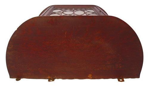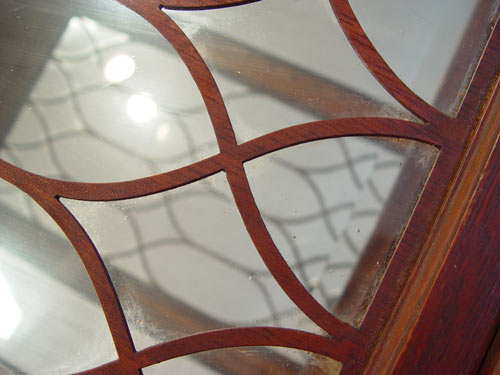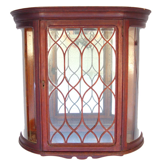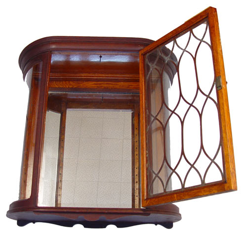 OAK BOW SIDE HANGING WALL CUPBOARD: Dark oak, beveled mirror interior (loss of shelves) 29 1/2''h. x 29 1/2''w. x 24''