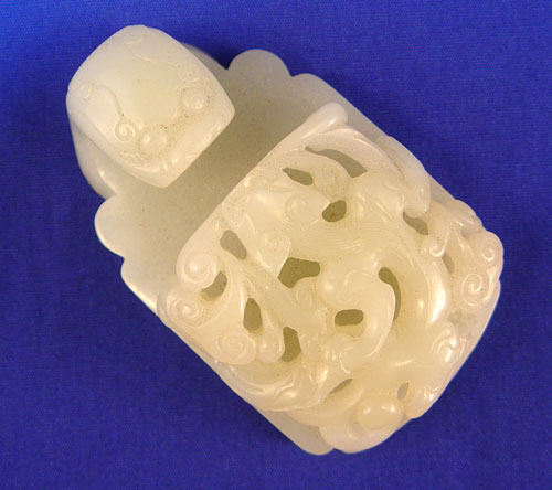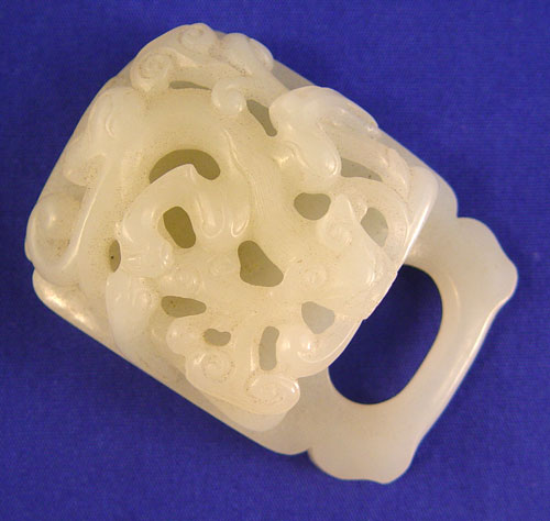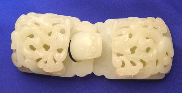 CHINESE CARVED JADE BUCKLE: Dragon design, 4 1/4'' x 1 3/4'' wide. Free of chips or cracks.