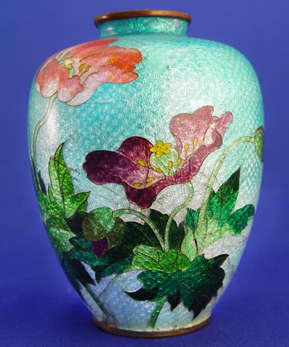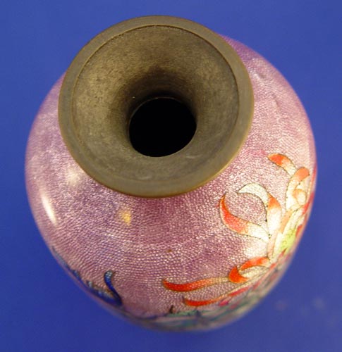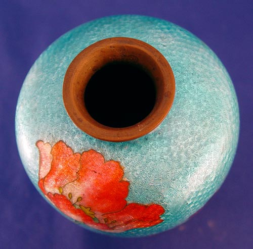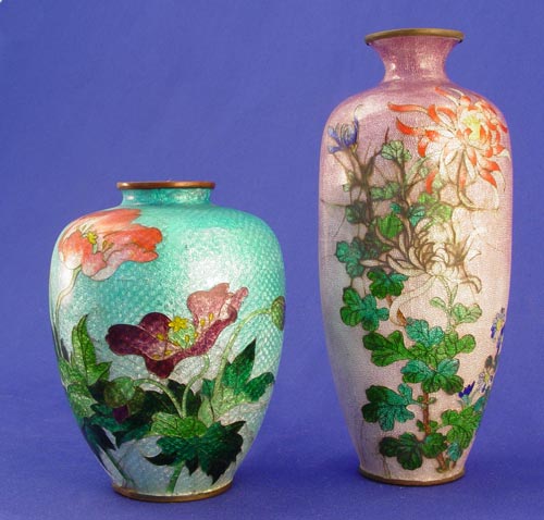 SIGNED JAPANESE GINBARI VASE PLUS EXTRA VASE: 1) Signed vase is lavender, 7''h. Please note cracks in lacquer. Bulbous turquoise vase, 4 3/4''.