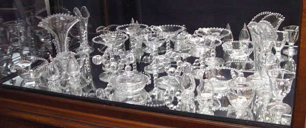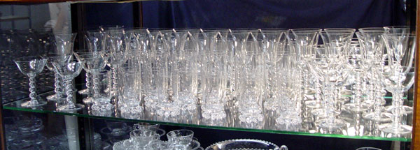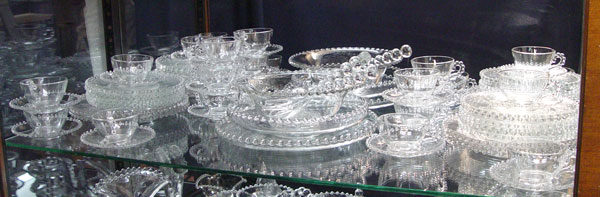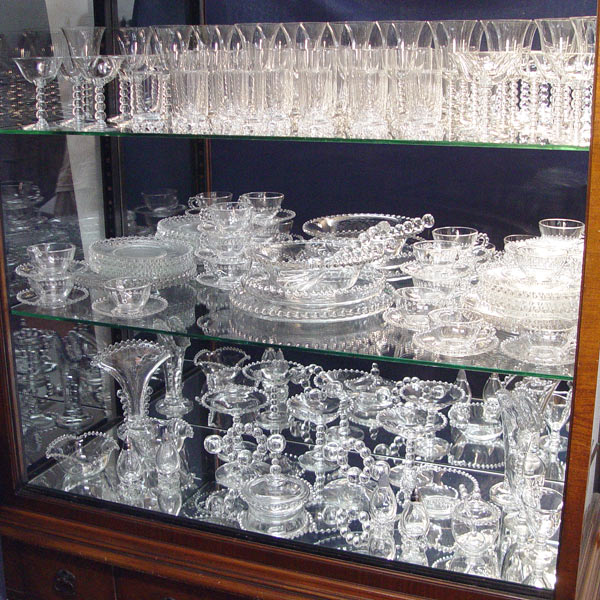 LARGE COLLECTION IMPERIAL GLASS CANDLEWICK: 101 pieces to include 12 water goblets, 12 sherbert champagnes, 12 (12 oz.) flat tumblers, 12 juice glasses, 12 cups and saucers, 12 plates (10 1/2'' dia), 6 plates (10 1/2'' dia), salad bowl, salad serving fork and spoon, 4 shakers, 3 compotes, (5 7/8''h.), 6'' dia. covered bowl, pair of 2 light candle holders, 2 flared fan vases, marmalade jar with spoon, 2 bowls (5 1/4'' dia.), small handle bowl (6'' dia.), cupped edge torte plate (13''), and a low bowl, 10 3/4'' dia. Original owners received most of it as wedding gifts, they just celebrated their 60th anniversary.