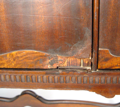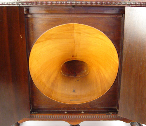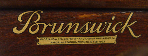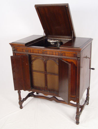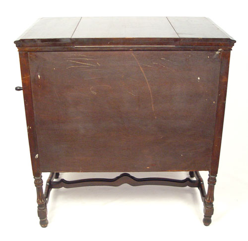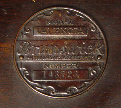 BRUNSWICK VALENCIA CABINET PHONOGRAPH: Valencia model by Brunswick, with Brunswick medallion, serial number 143723. Mahogany case with lift top lid. Cranks and platter spins, some speed variation when adjusted. In need of restoration, case has scratches, damage to one leg corner, missing piece lower corner of door. Unsure of working condition. No speaker. Measures 38 3/8'' high x 36'' inches wide x 21 1/4''.