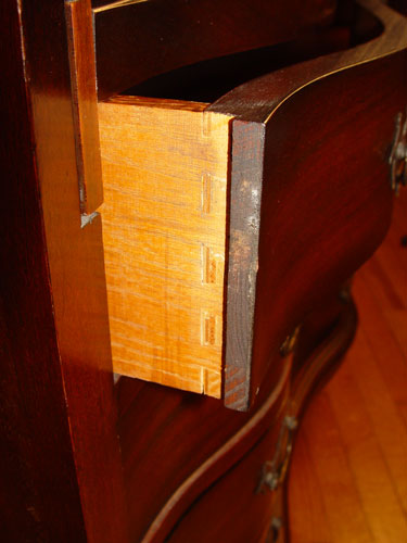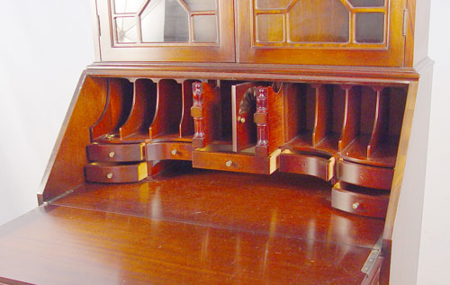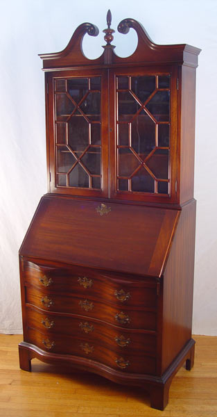 MAHOGANY GOVERNOR WINTHROP SECRETARY BOOKCASE: Two part bookcase over a drop front slant desk. The desk has interior pigeon holes and drawers, the full length case drawers are serpentine front. ''Genuine Mahogany'' label. 75''h. x 36'' x 21''.