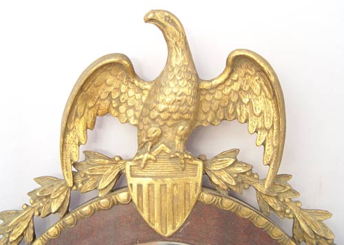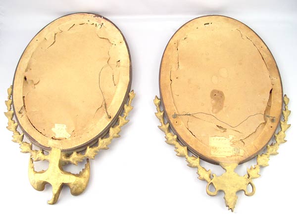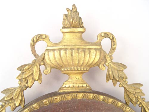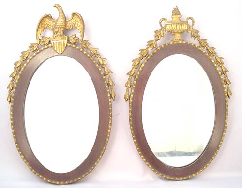 2 EARLY 20TH CENTURY GILT WOOD OVAL MIRRORS: Mahogany veneer with carved gilt wood. Matched pair with exception of gilt wood finials. One has eagle with shield, other has urn finial, both have wreath decoration down sides. Please note several cracks on finals and wreaths, still solid. Gilt wood stringing around edges, missing one small piece on one mirror. Both measure 17 3/4'' in length x 10'' wide oval.