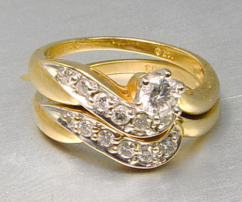 14K .38 CTW DIAMOND BRIDAL SET: 14K yellow gold bridal set with 1 round brilliant cut diamond weighing approx. .18 Ct., rated SI1 in clarity and H-I in color. The ten round brilliant cut diamonds have an approx. total weight of .20 Ct. Rated SI in clarity and H-I in color. The diamonds are prong set. Weight: 5.2 grams. Size 5.