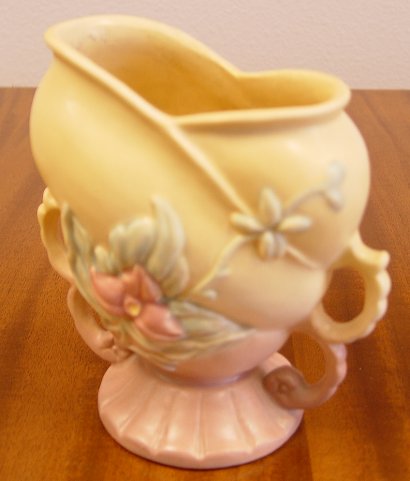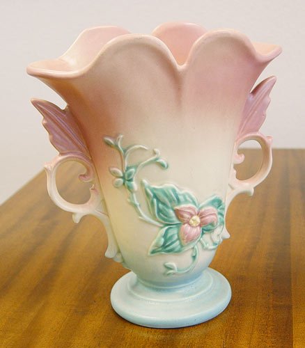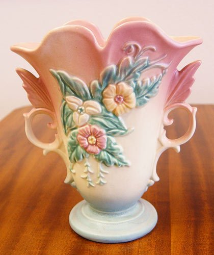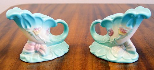 5 PIECE COLLECTION OF HULL POTTERY: 1) ''Wildflower'', W-9-8 inches. 2) ''Wildflower'', W-5-6 1/2 inches 3) ''Bow-Knot'' console bowl, B-16-13 1/2 inches 4-5) ''Bow_Knot'' 4 inch candle holders. Signed.